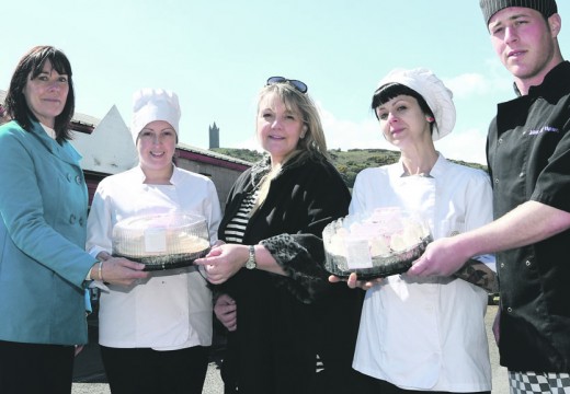 Beatriz Correa Sola and Marta Cayrols Cervera showcase their delicious cakes with Slice of Heaven Managing Director Heather Boyle and manager Gareth Brown and SERC International Project Manager Elaine McKeown.